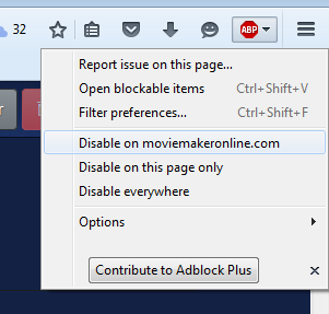Εγκαταστήστε το AdBlock Plus για το Chrome και προσθέστε τον ιστότοπο moviemakeronline.com στη λίστα εξαιρέσεων. Το δωρεάν λογισμικό αποκλεισμού διαφημίσεων AdBlock Plus εγκαθίσταται ευκολότερα από το μενού ρυθμίσεων. Κάντε κλικ στο εικονίδιο «Ρυθμίσεις και έλεγχος» επάνω δεξιά, μεταβείτε στις «Ρυθμίσεις» και έπειτα στις «Επεκτάσεις». Πληκτρολογήστε «AdBlock Plus» στη γραμμή αναζήτησης. Θα ανοίξει μια σελίδα με διαθέσιμες επεκτάσεις προς λήψη και ανάμεσά τους θα υπάρχει και το απλό AdBlock. Η προαναφερθείσα επέκταση έχει δημιουργηθεί από διαφορετικό προγραμματιστή· αν και περιέχει σχεδόν τις ίδιες λειτουργίες (επίσης μπλοκάρει διαφημίσεις), είναι κάπως ελλιπής. Επομένως, επιλέξτε από τη λίστα το δωρεάν AdBlock Plus και εγκαταστήστε το. Μεταβαίνοντας στο moviemakeronline.com θα δείτε αναδυόμενο μήνυμα με αίτημα να προσθέσετε τον ιστότοπο στη λίστα εξαιρέσεων.
